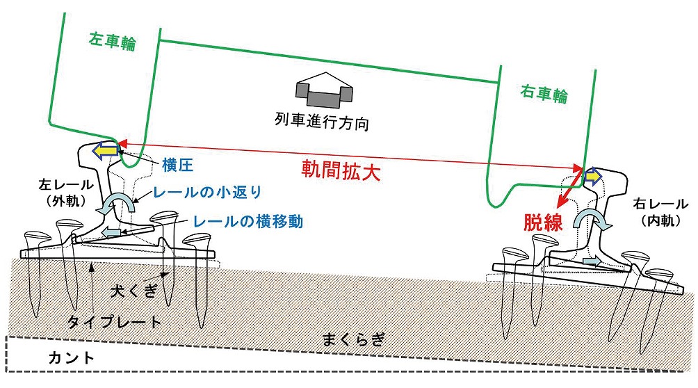 脱線事故は、列車が半径300mの右曲線を走行中に軌間が大きく拡大したため、先頭車両の後台車第1軸の右車輪が軌間内に落下し、以降の先頭車両後台車第2軸および後部車両の各輪軸も追随して右車輪が軌間内に落下したことに起因する。