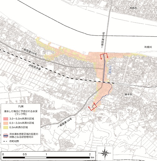 2022年3月29日指定の洪水浸水想定区域図(想定最大規模)では、沿川のみならず河口部の広範囲が「浸水した場合に予想される水深0・5~3m未満の区域」とされた。