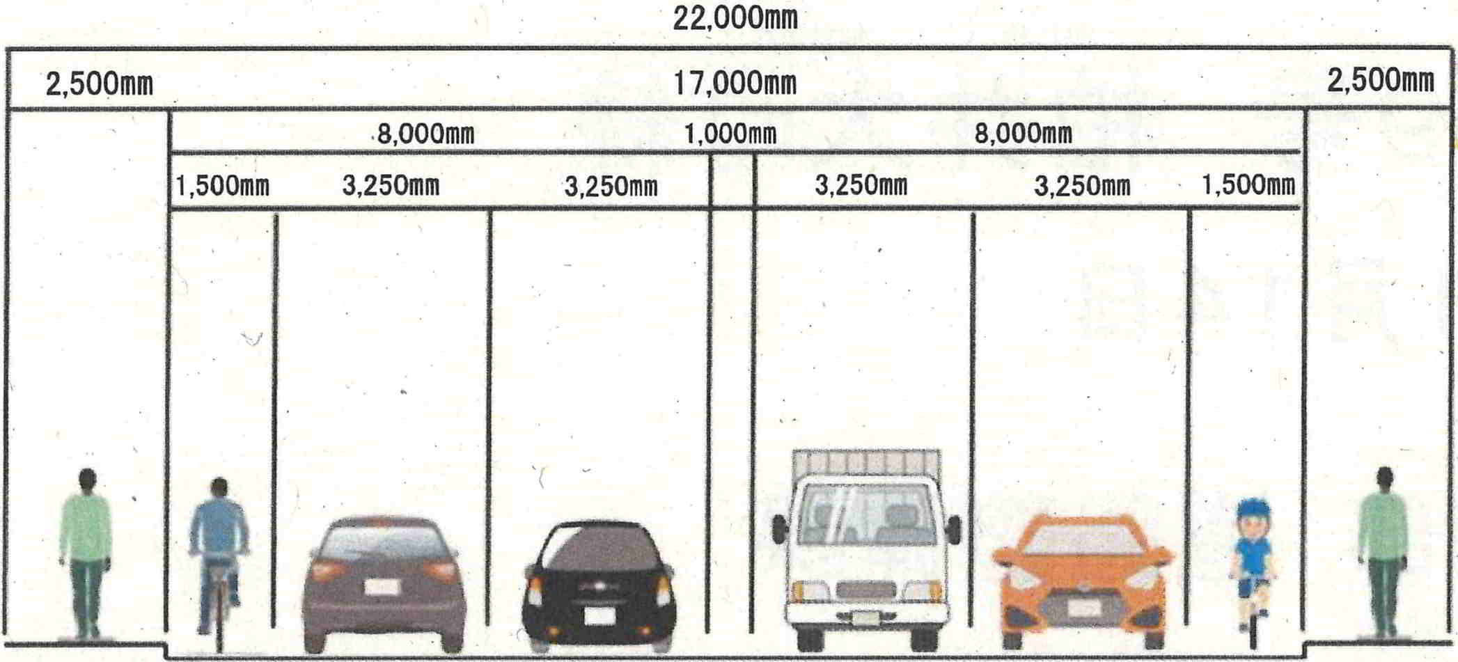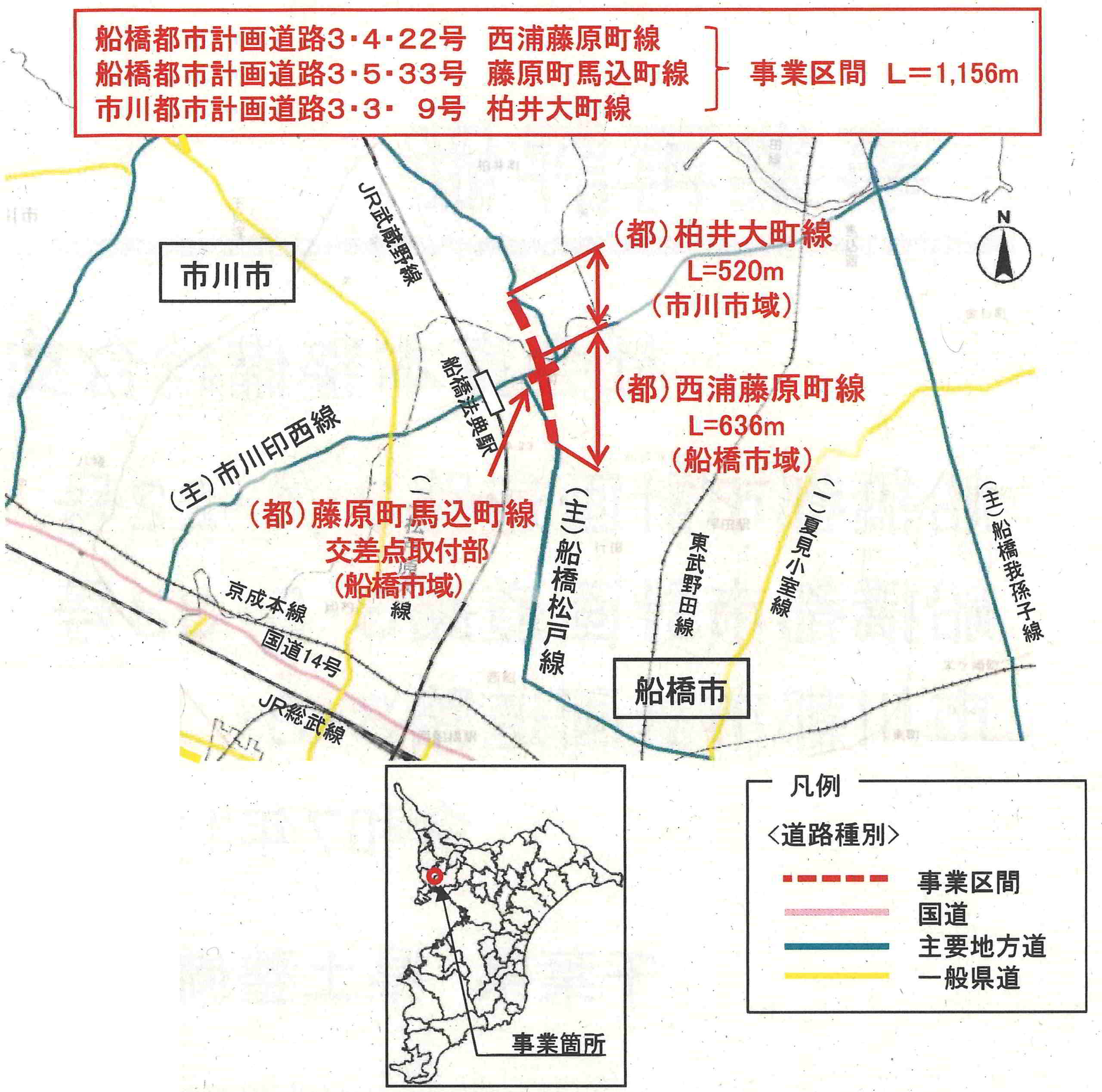 同街路事業においては、主要地方道船橋松戸線が主要地方道市川印西線とクランク状に交差し、慢性的な交通渋滞が発生していることから、交通の円滑化、安全性の向上を目的として4車線のバイパス整備を行っている。