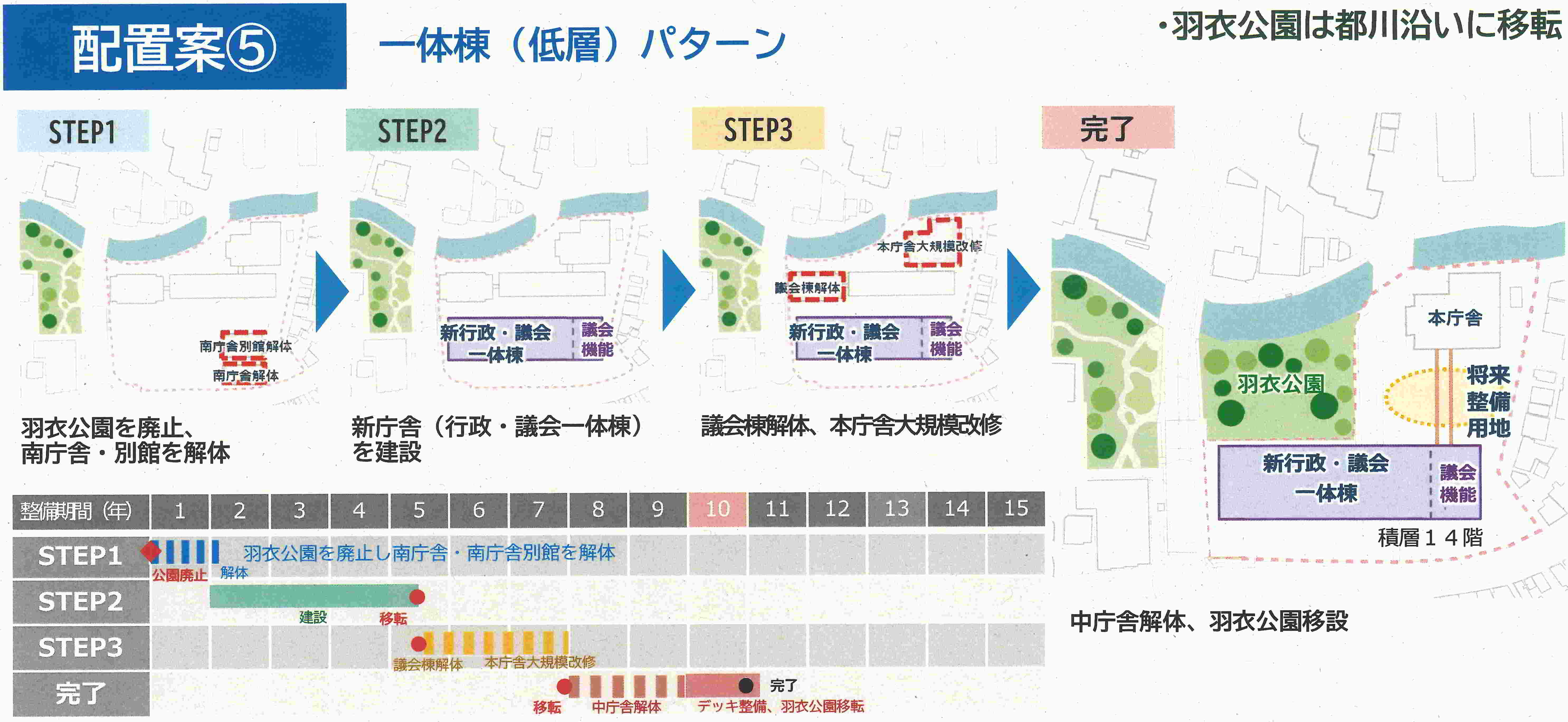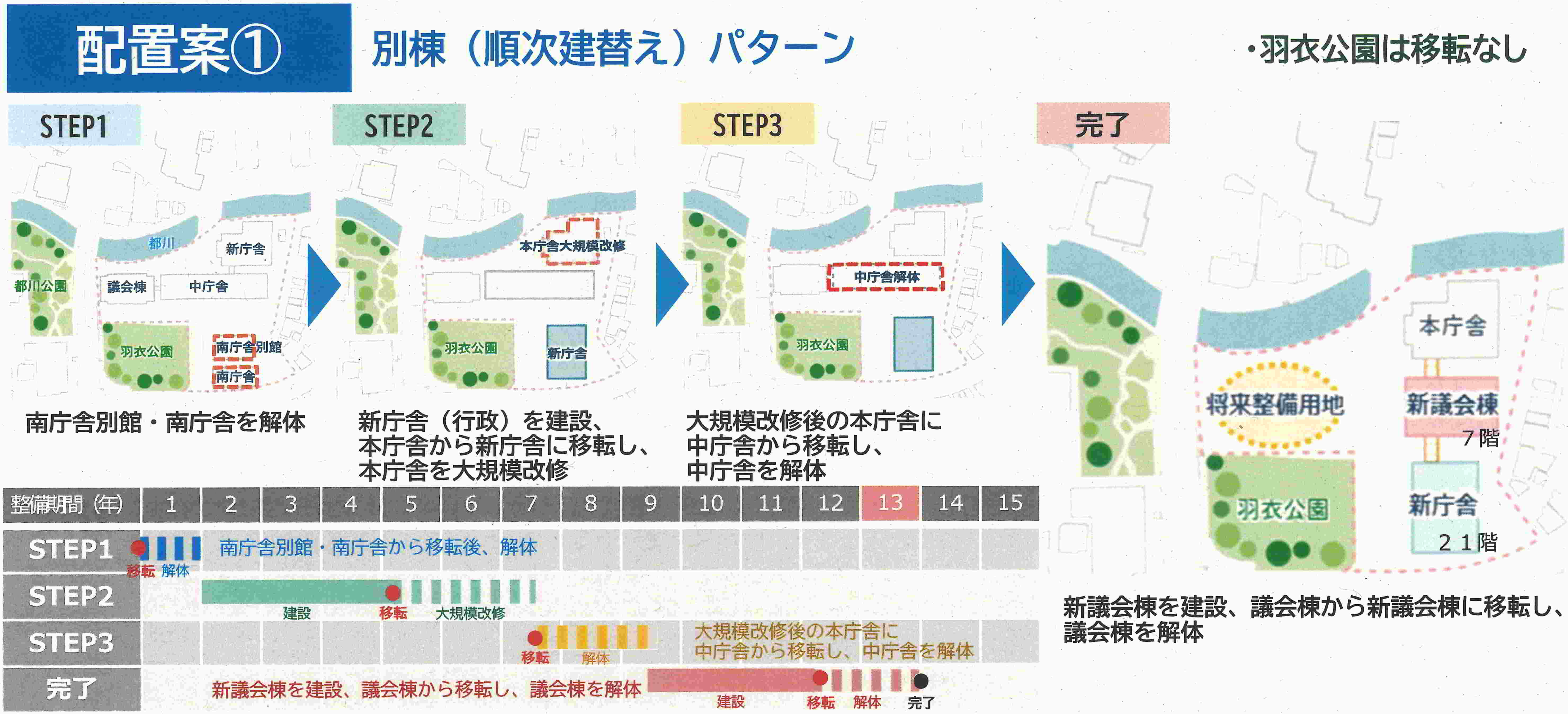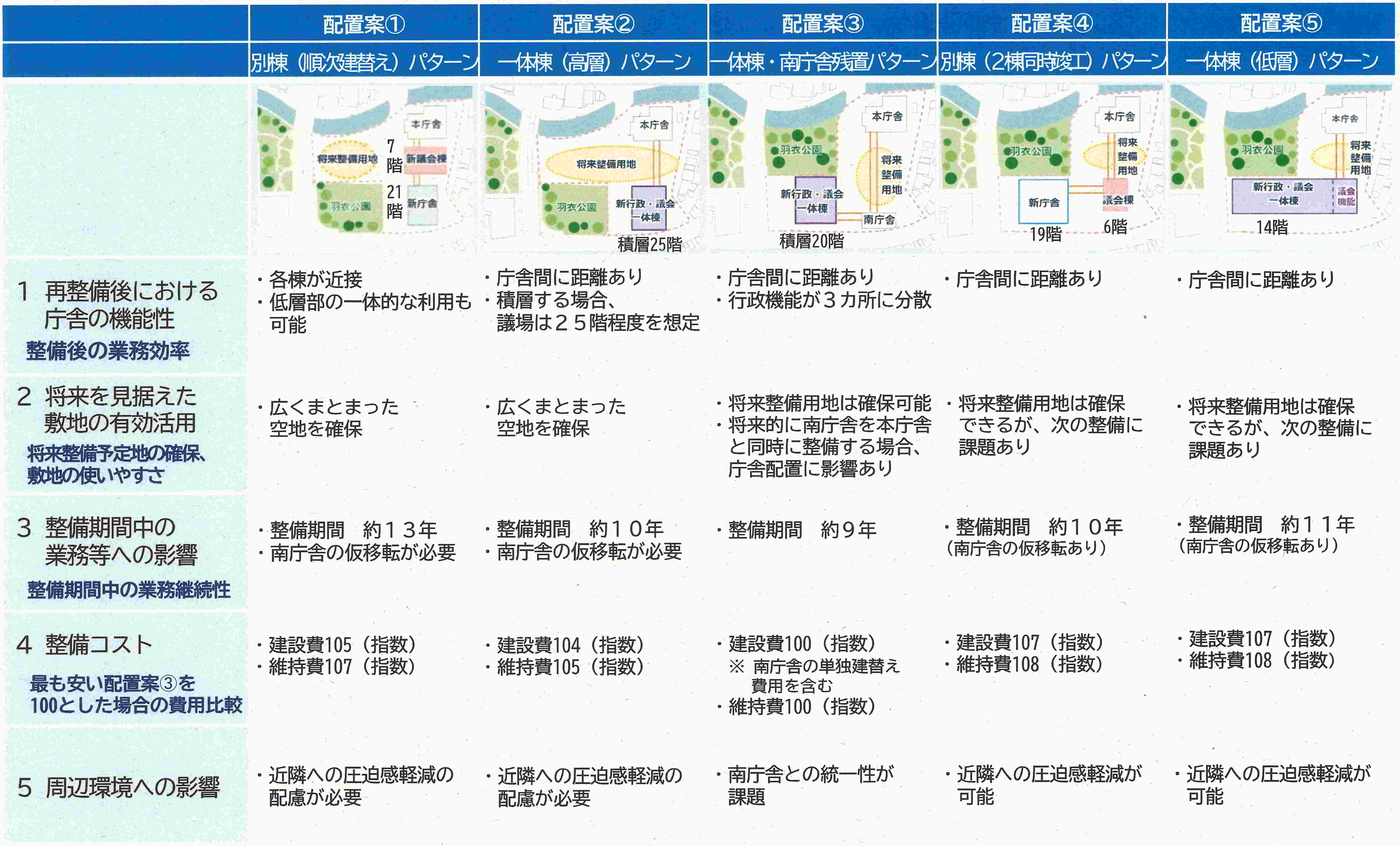 建物の配置案として①別棟・順次建て替えパターン(新庁舎21階建て、新議会棟7階建て)=工期約13年(南庁舎の仮移転が必要)、建設費指数105・維持費指数107(最も安価な③を100とした場合の費用比較)②一体棟・高層パターン(25階建て)=工期約10年(同)、建設費指数104・維持費指数105③一体棟・南庁舎残置パターン(20階建て)=工期約9年、建設費指数100・維持費指数100④別棟・2棟同時施工パターン(新庁舎19階建て、新議会棟6階建て)=工期約10年(同)、建設費指数107・維持費指数108⑤一体棟・低層パターン(14階建て)=工期約11年(同)、建設費指数107・維持費指数108――を提示。