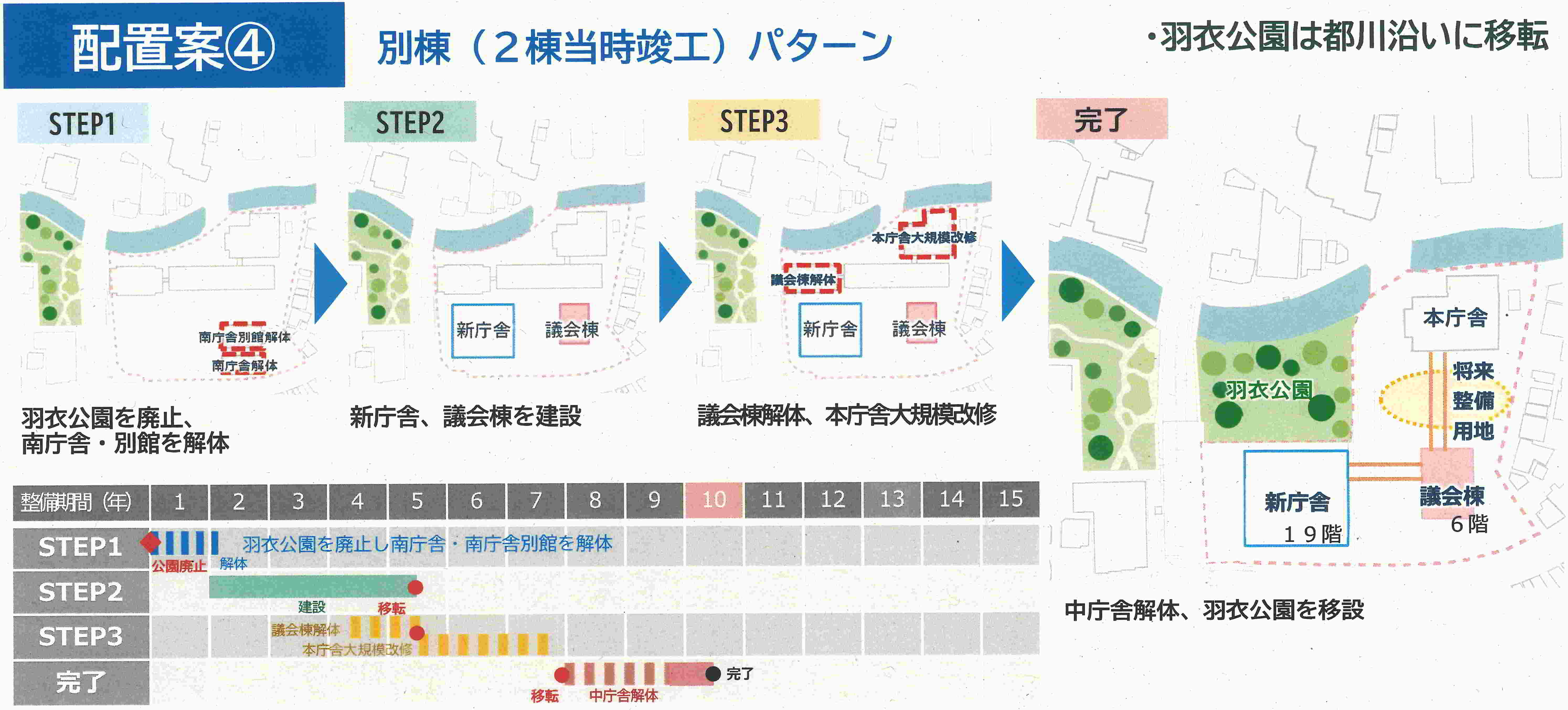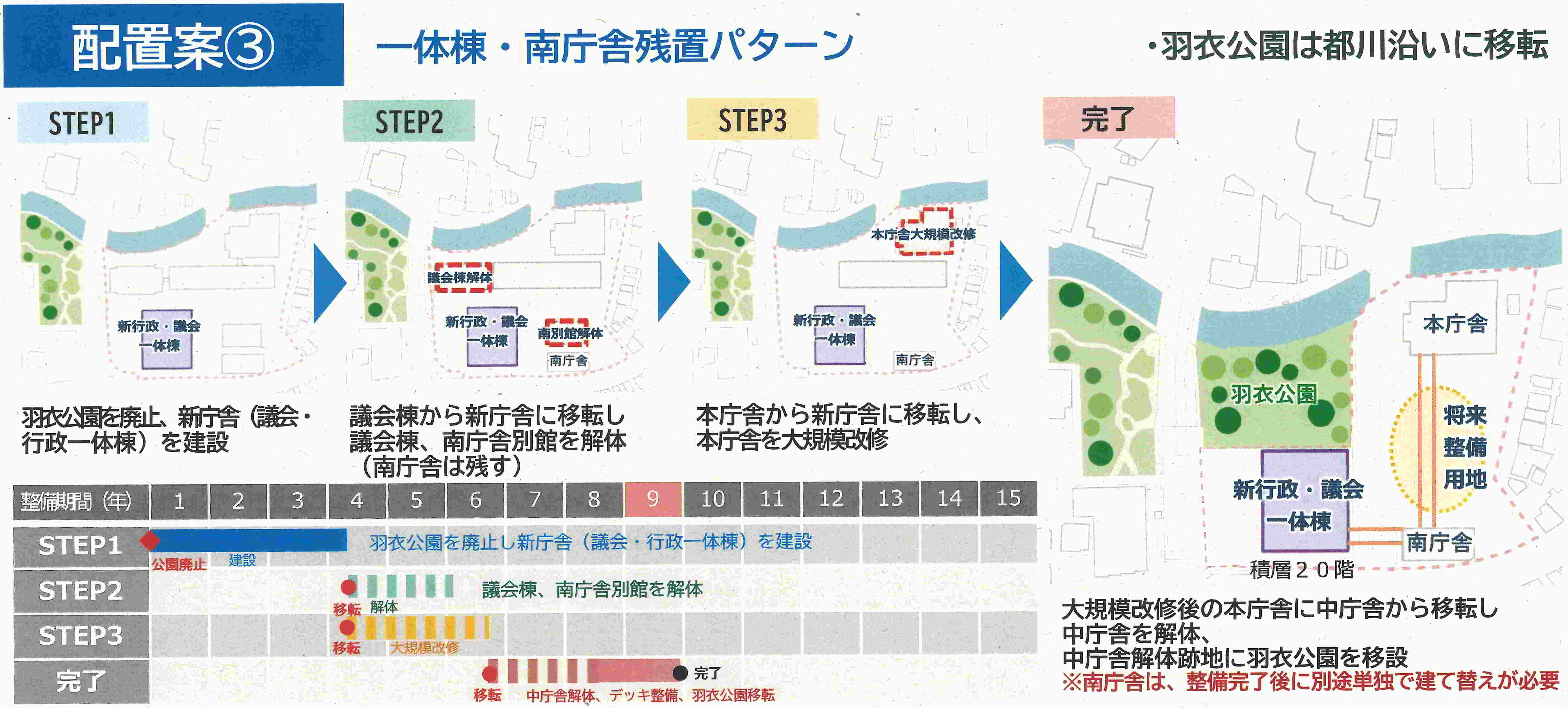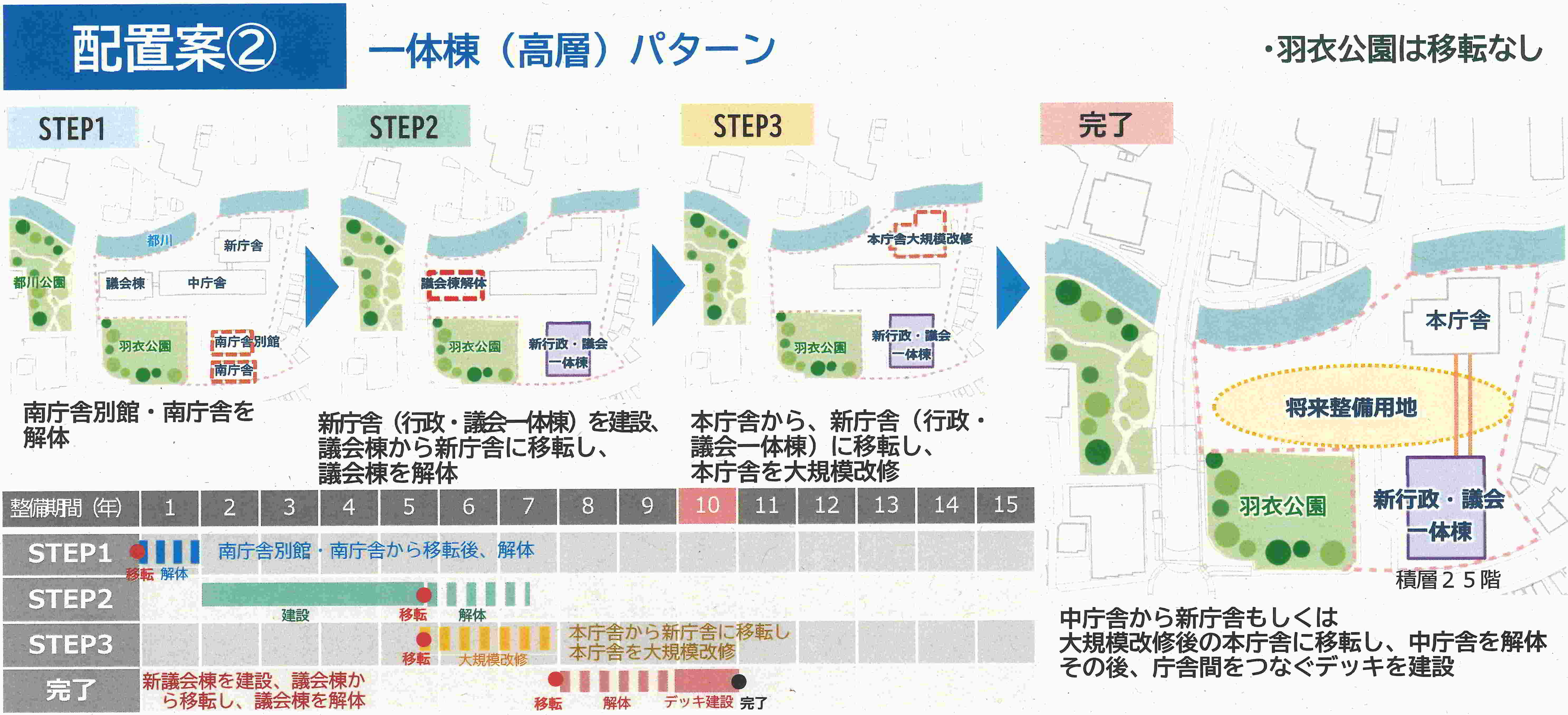建物の配置案として①別棟・順次建て替えパターン(新庁舎21階建て、新議会棟7階建て)=工期約13年(南庁舎の仮移転が必要)、建設費指数105・維持費指数107(最も安価な③を100とした場合の費用比較)②一体棟・高層パターン(25階建て)=工期約10年(同)、建設費指数104・維持費指数105③一体棟・南庁舎残置パターン(20階建て)=工期約9年、建設費指数100・維持費指数100④別棟・2棟同時施工パターン(新庁舎19階建て、新議会棟6階建て)=工期約10年(同)、建設費指数107・維持費指数108⑤一体棟・低層パターン(14階建て)=工期約11年(同)、建設費指数107・維持費指数108――を提示。
