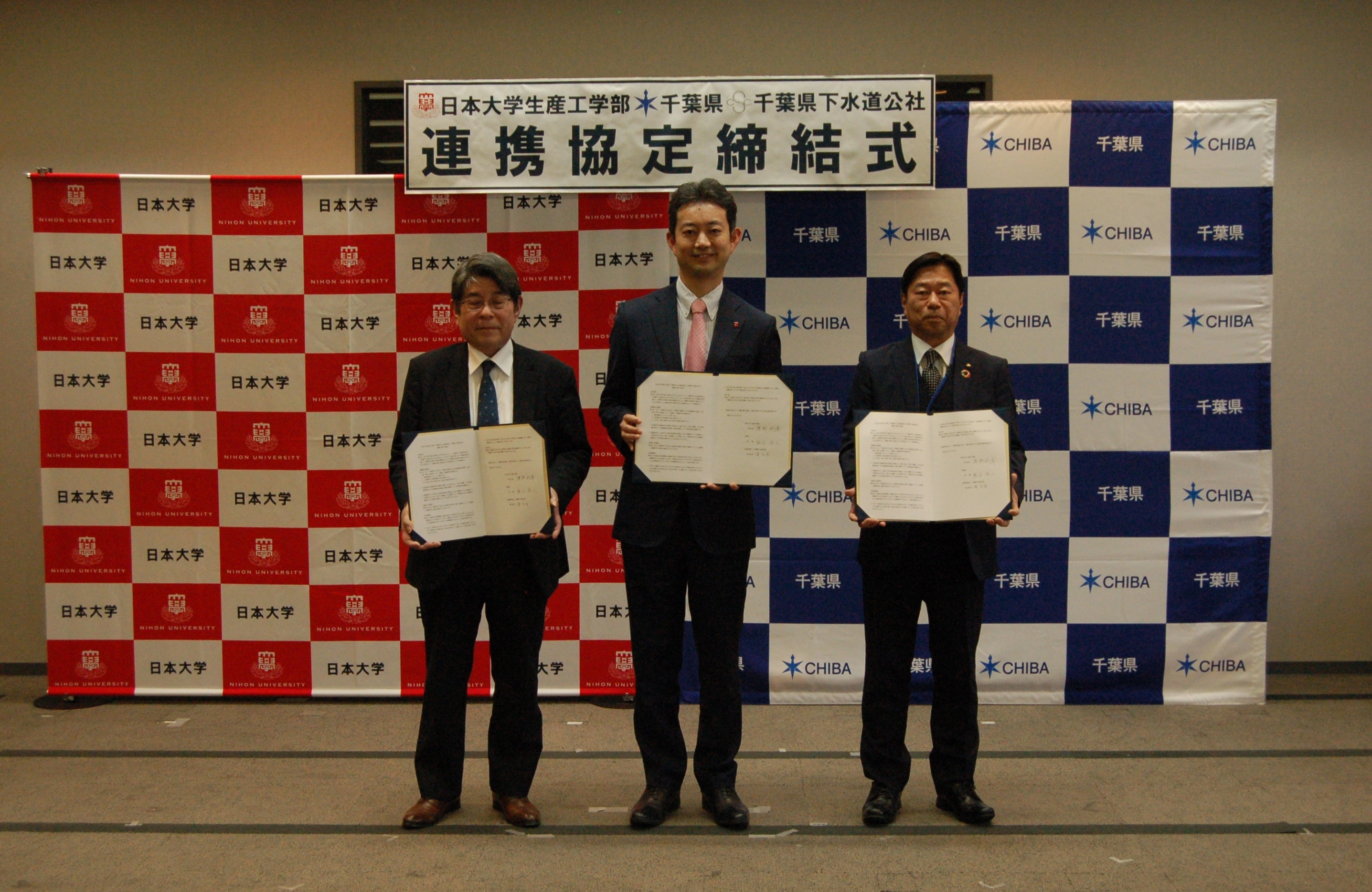県、県下水道公社、日本大学生産工学部は26日、下水道分野における調査研究に関する連携協定を締結した。同日に県庁本庁舎5階大会議室で行った協定締結式で、熊谷俊人知事は「下水道施設の老朽化が進む中、維持管理が全国的な課題となっている」との認識を示した上で、「下水道施設の維持管理マネジメントと、汚水・汚泥の処理手法などの調査研究に関する協定を締結する。協定による研究成果が、直面する課題の解決や県民生活の向上につながることを期待する」と述べた。
