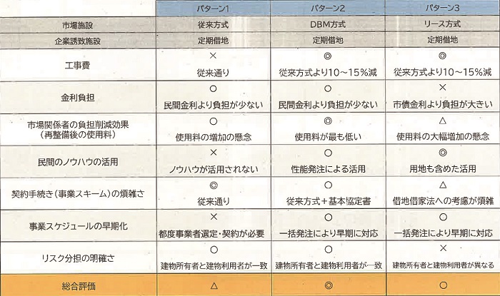 事業手法について、従来方式、DBM方式、リース方式の比較検討を実施。事業費および金利負担の抑制、場内事業者の負担軽減効果、事業スケジュールの早期化の観点からDBM方式に優位性があることを確認した。