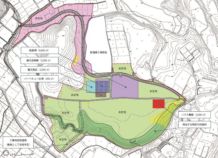 整備施設として、駐車場9000㎡、屋内余暇棟3000㎡、露天風呂2000㎡、バーベキュー広場900㎡、ハウス農園2000㎡を確保するほか、整備未定地をイベント広場として暫定的に活用する。