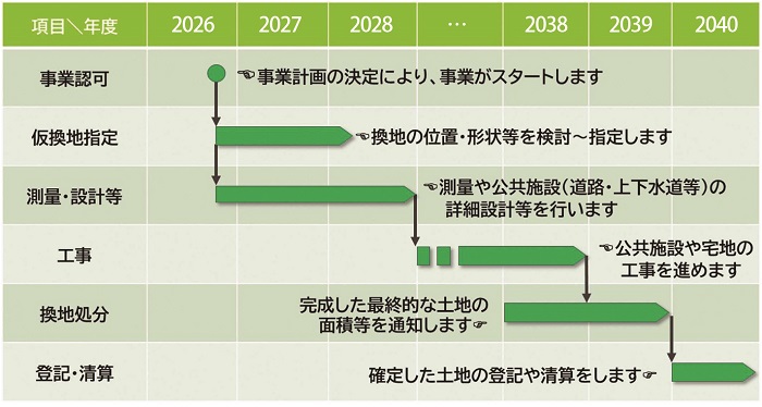 26年度は、県との事前協議を経て事業認可申請を行うほか、換地設計の準備を実施。さらに、地権者に対して換地に関する意向などの確認を行う。