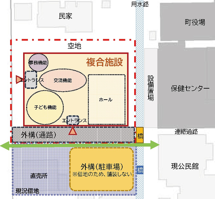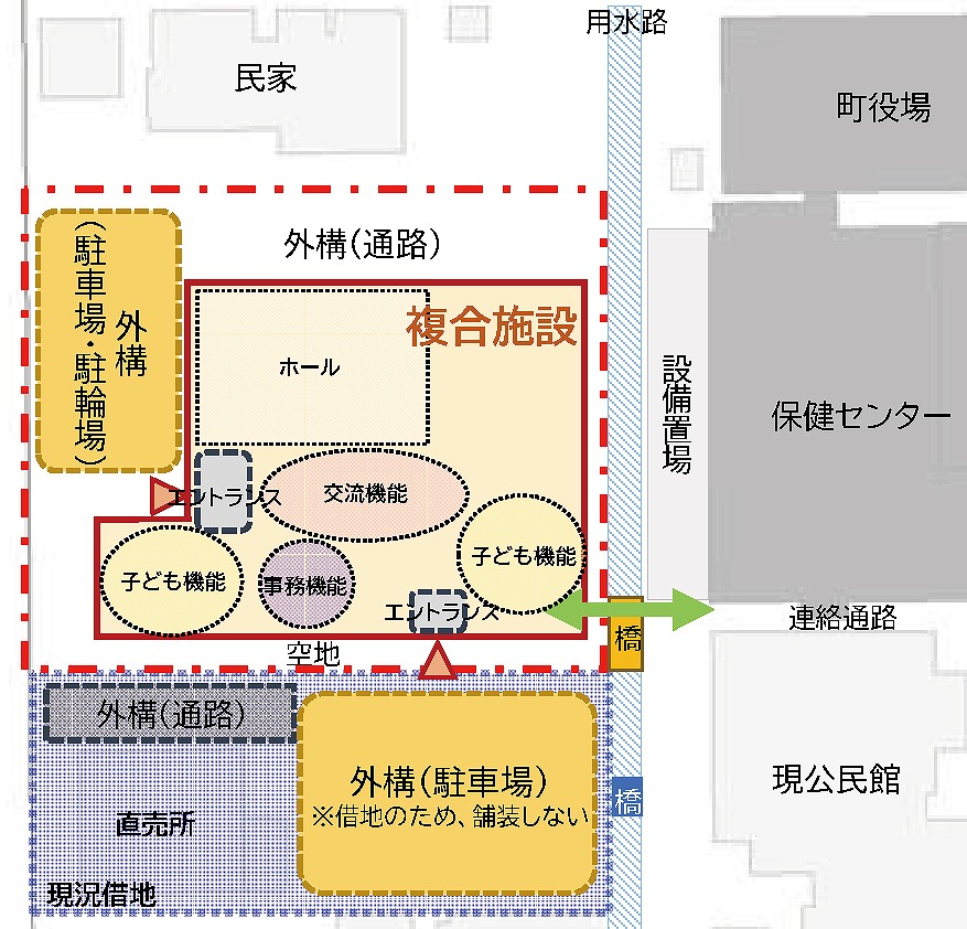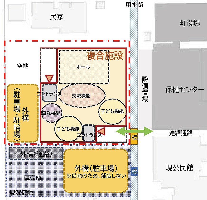 ゾーニングについては、保健センター西側職員駐車場約1878㎡を建設候補地とした上で、周辺施設間動線確保案(①案)、周辺環境に配慮した配置案(②案)、施設東寄り配置案(③案)を比較。町役場など周辺施設と接続するための連絡橋の整備を基本とし、次回以降の委員会で決定する運び。