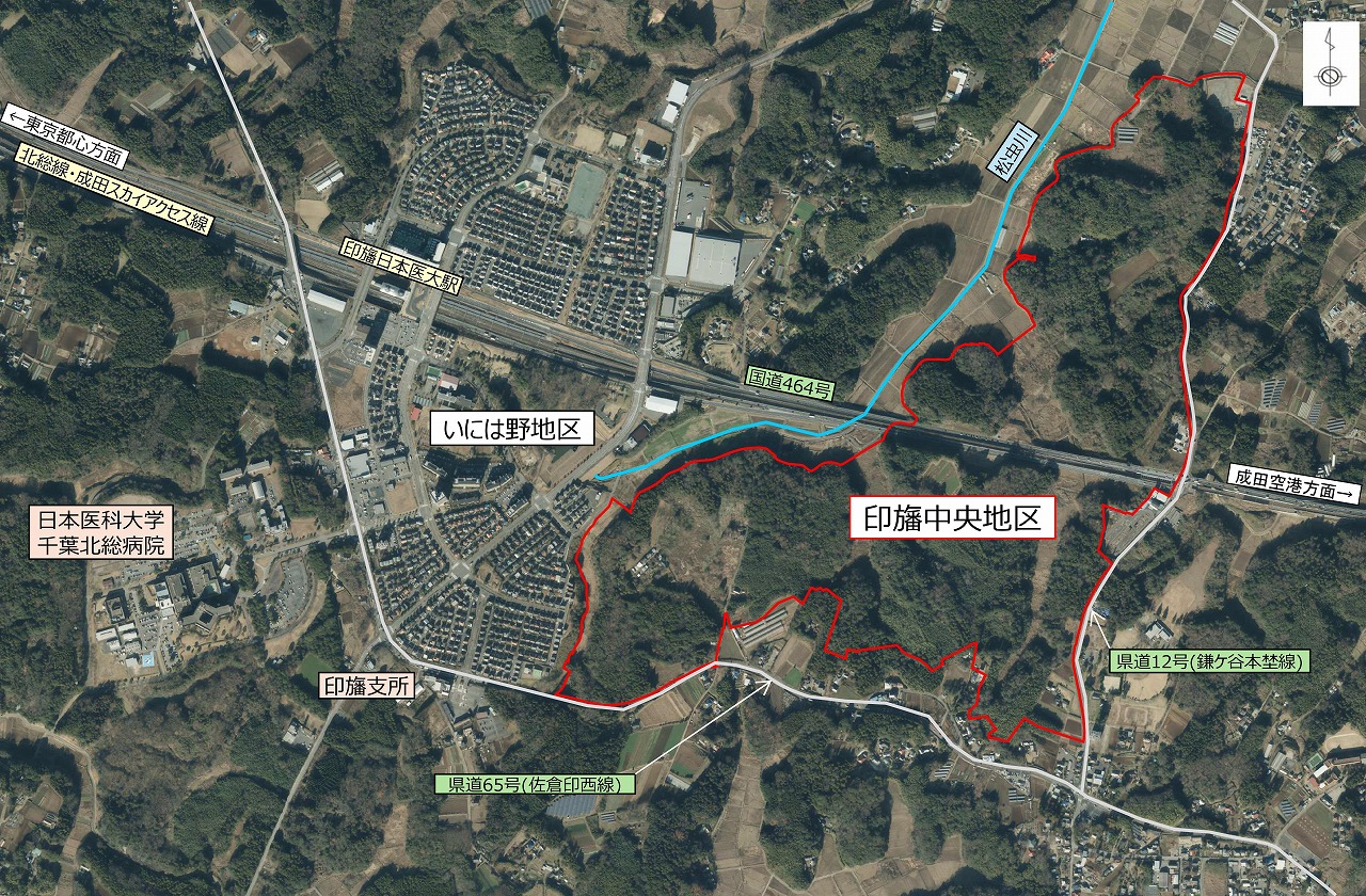 同地区は1997年5月に、住宅・都市整備公団(現・都市再生機構)の施行による土地区画整理事業として都市計画決定を受けたが、2007年度に事業の中止を決定。18年3月、市が都市再生機構から土地の無償譲渡を受け、19年度に地元地権者による「印旛中央土地区画整理事業発起人会」が発足。組合による土地区画整理事業の施行を目指したが、25年3月に解散した。